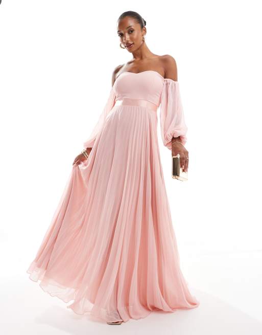 Product Name: Goddiva off shoulder bardot placement lace maxi dress in blush and gold sales